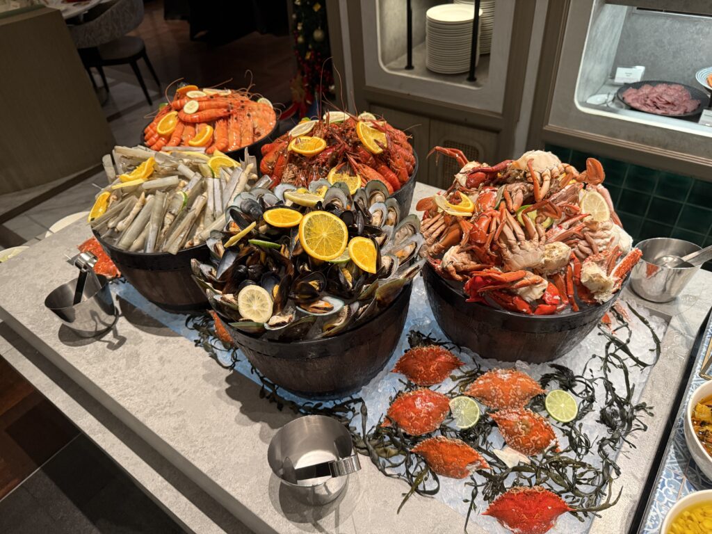 海鮮コーナーにはエビ、カニ、ムール貝、ホタテなどがありました。