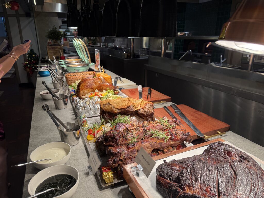 プライムビーフリブのローストやローストターキー、ハニーグレーズド・チキンハムなどのクリスマスらしいごちそうが並びます。